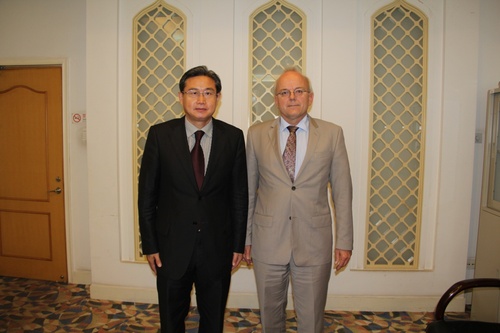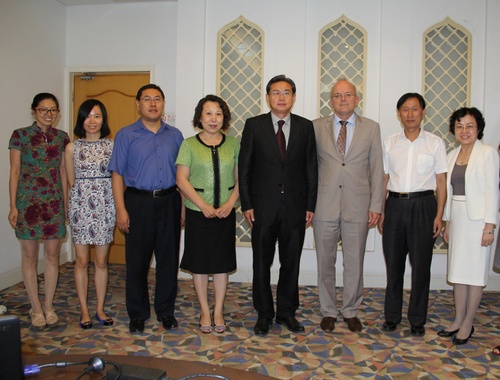 9月8日上午,我校王鲁新副书记在会议中心第九会议室会见德国波恩大学代表团,与该校德国著名汉学家、汉学系主任廉亚明先生商谈共建孔子学院事宜,取得重要进展。汉语国际教育学部张旺熹主任、孔子学院事业部陈丽霞主任、邱萍副主任、孔子学院工作处付继伟副处长等出席会议。